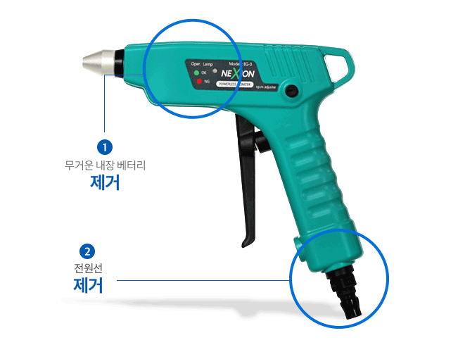 NEXION은 전원선과 충전이 필요없는 자가발전식 제전건입니다.